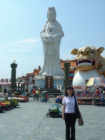 到了基隆,找到中正公園對面的一個停車場,想也沒想就把車停了進去,然後就走上中正公園。天氣很熱,這裡我也來過幾次了,所以主要是帶彩蓮走走,先是看起像廟的文物館,裡面介紹了台灣中元節的一些事和釋迦佛的故事。文物館外停了很多車,就想說早知道就不要去停停車場了…再來要看的當然是那一座觀音像囉!彩蓮一看到可以進觀音裡面就想要上去,但是我記得很久以前來的時候,說要"樂捐"超過一百才可以進去,所以我們就沒有進去了,只有在外面拍拍照。因為我們到的時間還很早,玩的攤位沒幾個,就隨便找了一個彈珠台玩,最後只得到了一張貼紙…