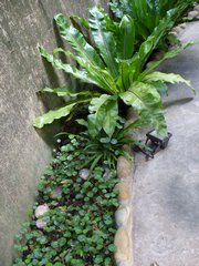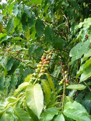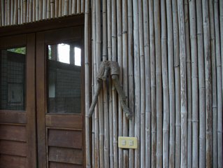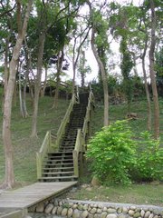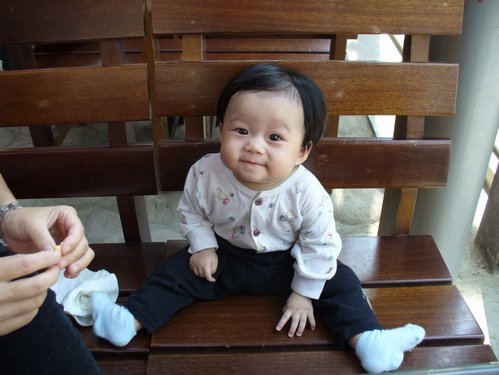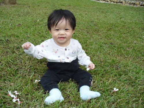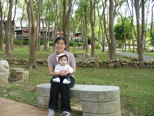 吃完到外面樟樹林走走,旁邊也種了一些咖啡樹。後來看到有人從遠方一個木階梯下來,我們就上去走走,剛好吃飽運動一下。上去後感覺另一邊就是別家休閒農莊,但是不知道會通到哪兒,抱著小樂樂還蠻重的,只好先下來到草坪讓小樂樂接觸一下草地。小樂樂很認真的拔草,都不看鏡頭,好不容易才照到一張,然後…小樂樂就把草塞到嘴裡啦!啊~~