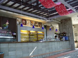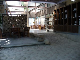 再看看內部裝潢,在裡面用餐感覺很輕鬆、悠閒,一餐很少吃超過十五分鐘的我也吃了1個小時,裡面還有一個咖啡烘焙場。除了些植栽、造景,外面還有一片樟樹林,秋天吹著涼風,舒服的想睡覺…小樂樂跟彩蓮