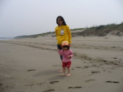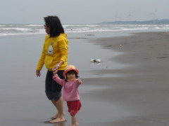 這時樂樂吵著要下來走走,正好蝴蝶館旁有條路可通往海邊,我們就決定走過去看海。樂樂與媽媽把鞋子脫了放在一旁,要走過去踩踩海水,我則在旁負責照相跟注意海相。