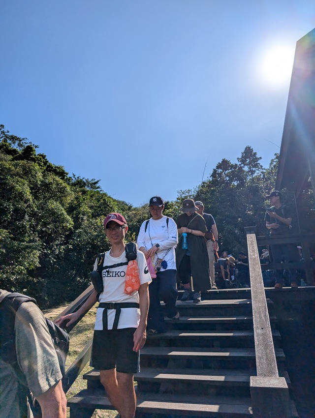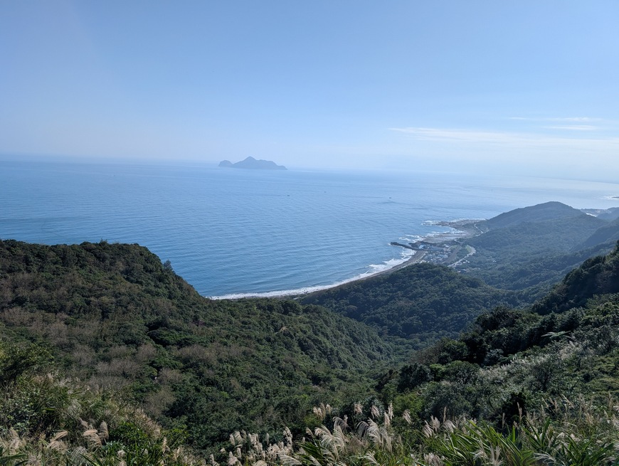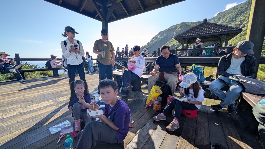 大約二小時到了啞口的涼亭,少了一開始那段柏油路真的有差,這次到啞口我都沒有累的感覺,天氣很涼爽,水就沒有喝太多(我通常都是喝很大量的水)。大家在這裡休息吃午餐,便當、點心、零食、水果,還有Jo帶來的蛋糕…大家都想說帶東西到山上分食,結果大家都帶了不少也都分不太出去。淑嬛似乎沒吃什麼東西,也幾乎沒坐下休息,感覺連汗都沒流幾滴,真的厲害。我們的運氣算不錯了,前幾天氣象報告都下雨,今天剛好放晴,能見度也不錯,龜山島清清楚楚,可惜芒花尚未全開,未見一面白芒芒。