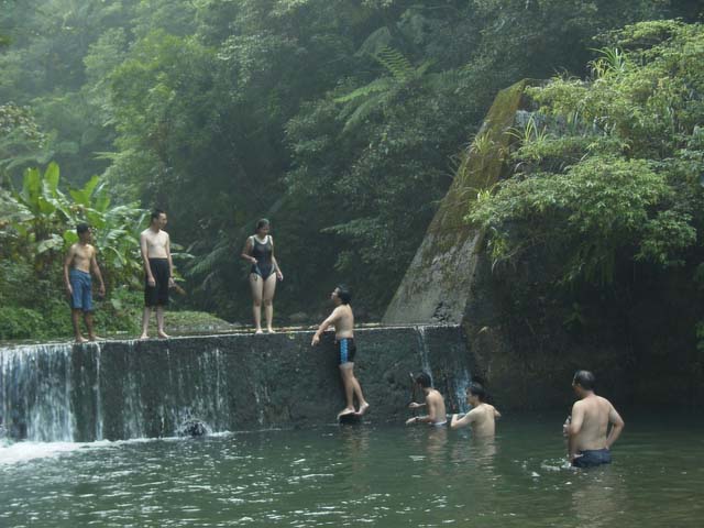 早上在附中打完球後(本人又是10投10中),趕緊回家洗個涼爽的澡,下午一點要趕到台大門口集合,天氣實在是很熱,應該超過36度吧!沒想到到了台大只有惟德,其他人呢?等著熱到受不了還買了兩瓶飲料。等到全部到齊準備出發已經快2點了,蕭偉志還要去接梁信陽,於是約在烏來集合。在等待的同時發現剛剛買的兩瓶飲料居然放在惟德車中,忍不住又買了一瓶舒跑,最後終於在烏來車站集合完畢,這時也發現烏來已經跟以前完全不同,有點像菜市場,人多多...心中想說桶後應該不會很多人,大部分的人應該只是來烤肉而已,但是進到孝義時發現人一樣多,再往內前進,哇勒`@~$%...太誇張了,只要是比較像樣的地,幾乎滿滿都是帳棚。幸好渦蟲帶領大家到了一個不為人知且人煙稀少的營地,有水源、有營地(雖然不太平坦),重點是沒人,騎那麼久的車還是值得的!