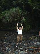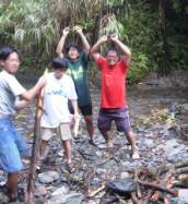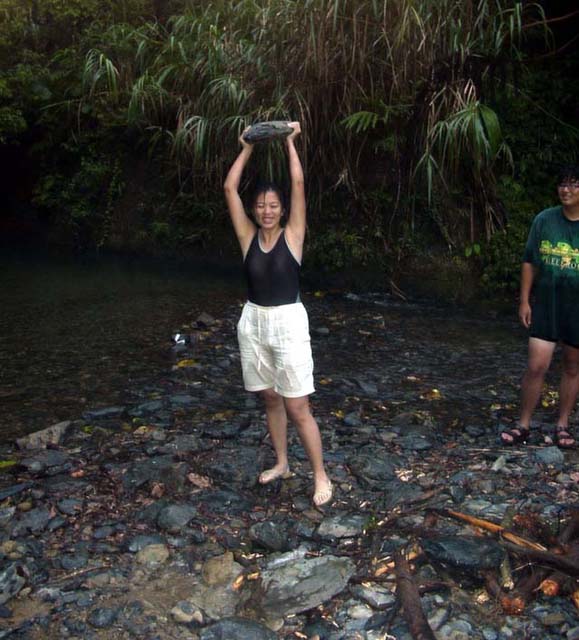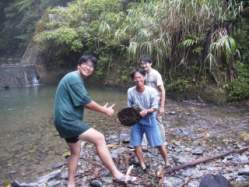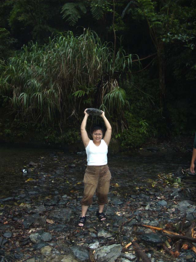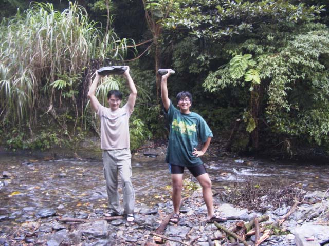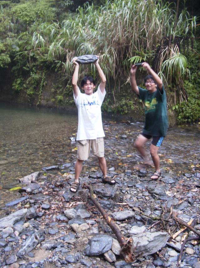 大家也想生個火,可是材很難處理,大家輪流使用大石頭劈材,效果不彰!而且材超濕,點不著,徐子雯還削了一些奇怪的火媒棒,最後還是靠著泡麵油包加衛生紙才生起火來,but 中型材不夠,一直都在燻材...管他的,晚餐煮好了還是先吃吧!