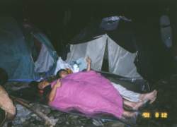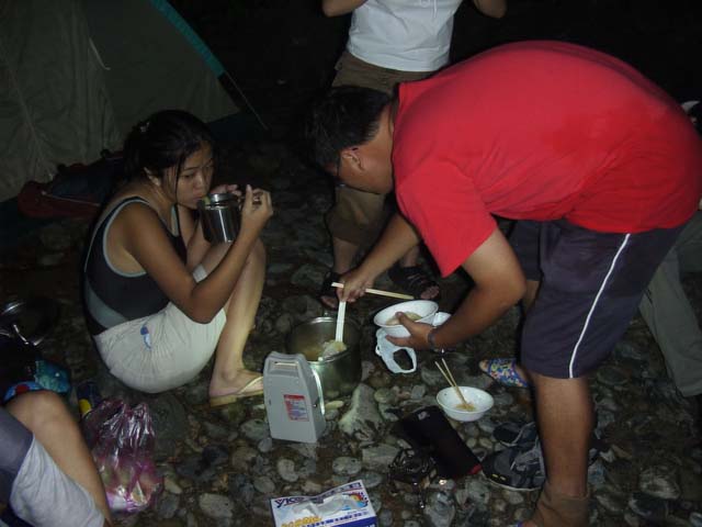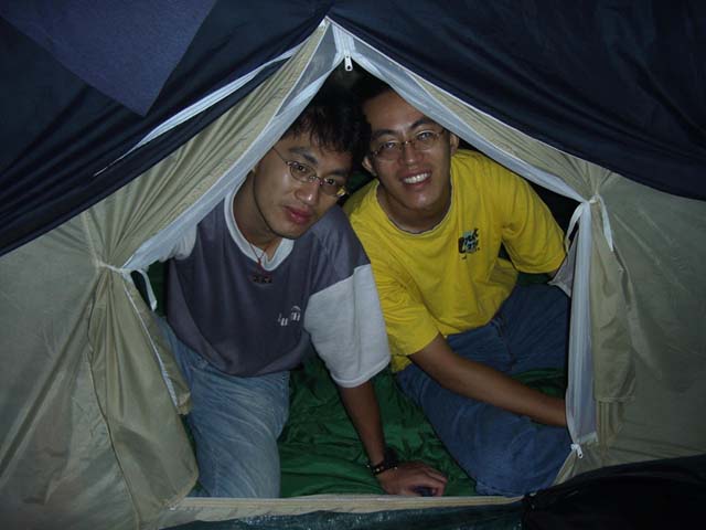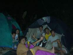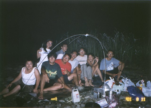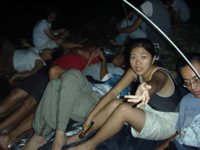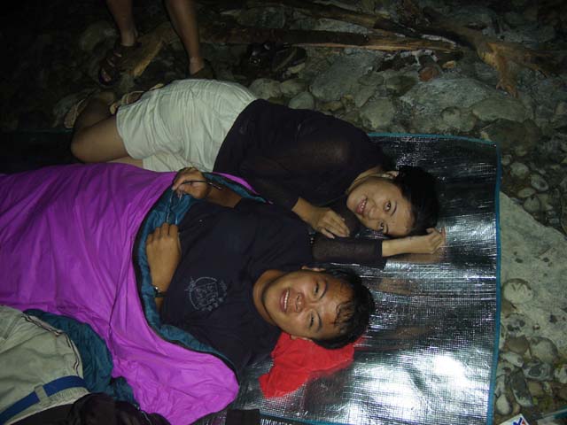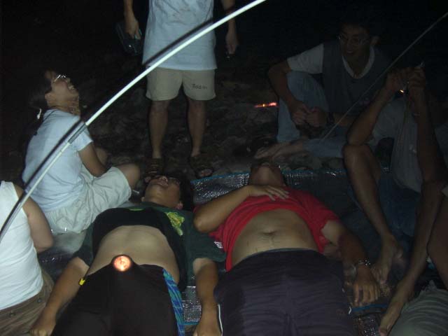 不知是誰說要玩牌,大家拿出睡墊,咦?居然只有我和蕭偉志有帶,而睡袋也只有3個,拜託...幫幫忙,其他人不知道來幹嘛?而經過了黑暗中看不清楚的激烈爭鬥,七級豬產生 -- 蕭偉志先生...!接下來他的處境相信大家都猜想的到。今晚剛剛好是英仙座流星雨極大值,大家躺下一邊欣賞流星,一邊說著不為人知的八卦,超勁爆!沒來的一輩子也沒機會聽到啦...惟德此時抓了一堆蝦烤來吃,本來我還不太敢吃,不過試過的都說NICE!