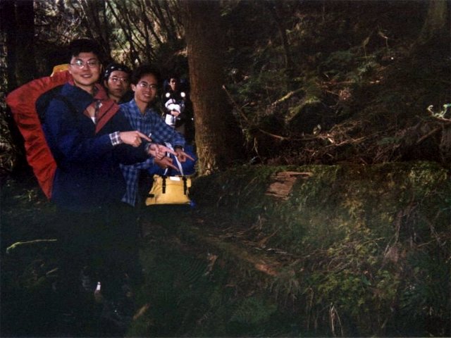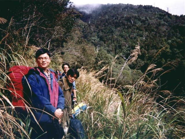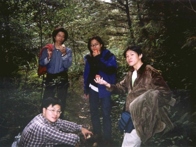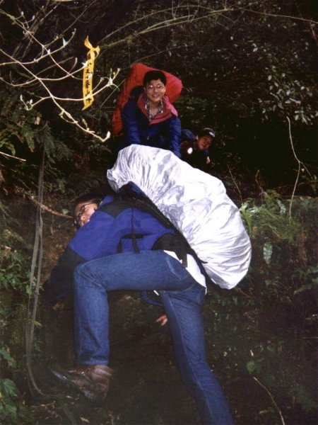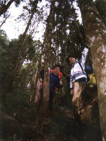 』的比例上山,看起來好像很墮落,但其實差不多是體力的負荷,小蔡還說已經半年沒有用腳力,只用上半身的肌肉...後期大家似乎漸漸習慣,休息也少了。一路上小張砲聲連連,搞的林道中充滿瓦斯味,哇哩ㄌㄟ,虧我一早起床就坐上馬桶清除廢物,結果仍然難逃瓦斯攻擊!而早在入山口之前就已經失去訊息的台灣大哥大居然在其中一段復活,趕緊打電話給彩蓮,彩蓮居然在家看電視,爽!