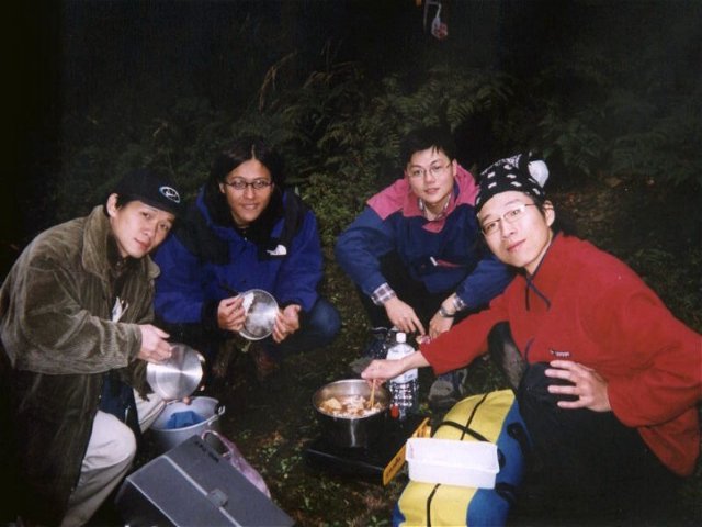 山上的羊肉爐實在太好吃了,但是也實在太多,第二波都還差一點吃不完,還好一邊聊著交友八卦一邊就解決了,內容也是極精采。營地建設、整背包、鞋子等等東西加上在帳棚中晚餐後大家都累了,而且很溫暖,七點一到大家躺平就寢,沒兩分鐘小蔡就失去知覺,叫都沒回應,我因為睡在上風處,風一吹就外帳貼內帳,加上帳內的濕氣,於是我的位置開始下起小小的帳棚雨,加上小張的瓦斯味不時襲來,我想說毀了,晚上睡不著了!隔天一定沒力氣下山,不過靈機一動拿起雨衣蓋住睡袋,不久就進入夢鄉,不過手錶每小時報時的B聲聽到兩次,此時應該已經過了晚上九點,結論是:帳棚要買好一點的。感覺睡了很久,醒來時應該是凌晨三、四點吧?按下手錶的夜光一看,嗯...馬錶,可是按切換鍵怎麼也找不到時間欄位,哇~~壞了?原來是午夜12點,24時制看起來全部是零(00:00:35,12點0分35秒)