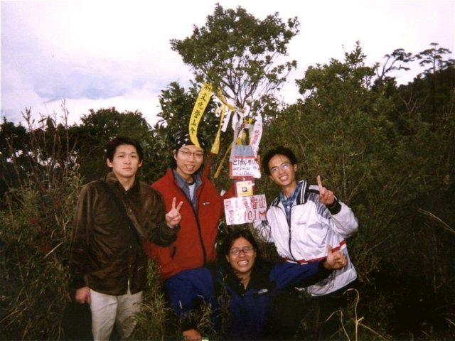 16:03到了關鍵性的棲蘭山叉路,路標清楚精緻,顯然是有心人做的,而16:00的休息就有點鳥,應該再撐3分鐘的。終於......約下午四點半登頂,小蔡要與我擊掌,我卻沒看到,糗!山頂視野佳,有個一等三角點,大家趁天未黑和標高2101M的牌子照相,留下好天氣證明,爽啦!此時腳下的雲海...可惜天色略黑,天氣也有些陰,否則一定相當棒!稍做整地後開始營建,風大氣溫低,大家決定只搭一頂帳,也想到早知道就丟一頂在台北車站了。
