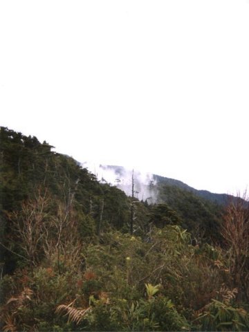 拔營後立即下山,此時因為下雨大家都穿起雨衣,也因為下雨,氣溫比前一天低很多,視野也不好,不幸地,我們走錯了路,越走越奇怪,更奇怪的是路上似乎又有似曾相識的感覺,使我們走上往棲蘭山的歧路,好不容易走了約一個多小時,見到一條乾的水路,此時決定走回原路,以免發生山難,在此 stone 留下第三坨屎...為免再走回錯路作記號...也眼見我的手錶有指北針功能,其實早知道走錯路,不要再錯下去,才決定回頭,不然到了棲蘭山再過一夜,我的褲子全都濕了,晚上一定睡不下去!