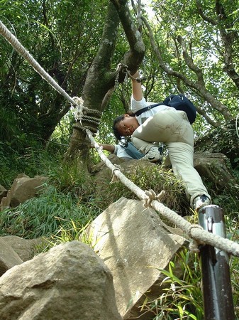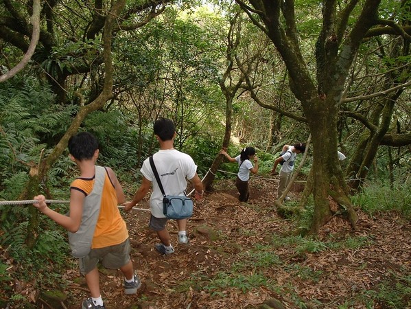 小傑雖然看起來很累,但是一路上一直衝,真不愧是年輕人,而廖麗玉一路上都不太行的樣子,可見平時缺乏運動。來之前,彩蓮灌輸大家不會很累的想法,但是...被騙了!足足走了五個半小時,途中還有必須攀繩索,手腳並用的路程,我們一次把「陽明山東西大縱走」的"大、縱、走"給走完,到後來都懶得拍照了。路上休息的點連個涼亭都沒有,更慘的是連樹蔭都很少,大家應該都有曬傷...