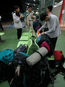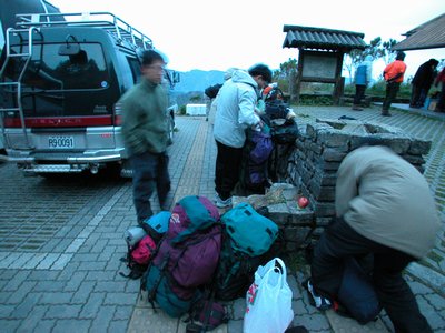 23日行前會,順便去買些不怕壞的東西、食物,確定了25日當晚集合時間和裝備。25日大家在分配好背包後就坐捷運到統聯,轉搭23點多的車到台中朝馬。到的時候司機大哥已經等很久了,真是敬業!上了車大家就開始想辦法睡,但是實在是難睡,二個多小時候就到了東埔停車場,司機建議大家先休息,天亮再出發,但是撐了一個多小時實在是睡不下去,只好起來吃吃早餐,此時也已經有許多人到此準備上山了。