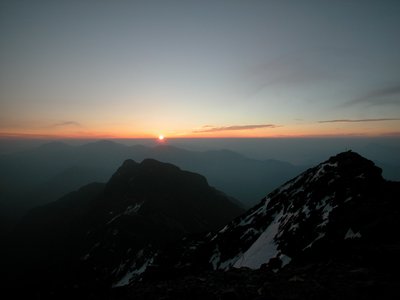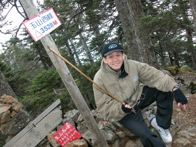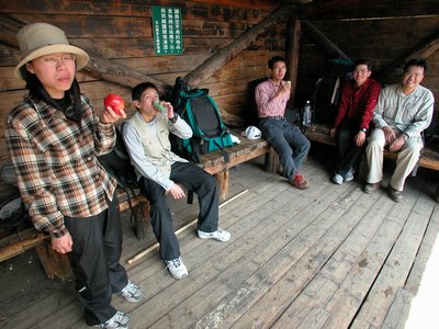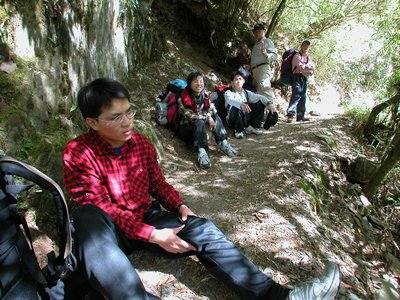 經過了又臭又長的山路後,曜成有抽筋的現像,還好有擦勞滅的幫忙,到排雲山莊之前都撐過去了。莊主分了床位後看看時間還早,於是就決定攻西峰。西峰雖說只有2.2公里,但是路跡不明顯,而且上上下下的,路上還有很多的箭竹林,一不注意就會走錯路,加上已經走了六個多小時的路,到了西峰頂時幾乎已經到了體力的極限,而這裡風大又沒有視野,所以拍了照片稍作休息後就趕快下山,以免走夜路,回到排雲時大家都不行了。