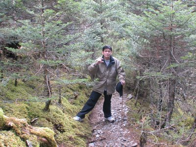 搶在其他人之前出發,到了檢查哨(湯為何要切腹?)把有的沒的證件給警察大哥看,填了資料就正式上路了。經過一段上坡的柏油路看到了一株大鐵杉,想當初森林實習時也來過,那時還沒跟彩蓮在一起呢!當時只覺得鐵杉的樹型很美,這次有了不同的感受,覺得已經跟大自然脫離了很久了,頗懷念大學那段時刻…再經過一段下坡路後就到了登山口,從這裡開始就是一連串的山路要走,當然要先來一張照片囉。