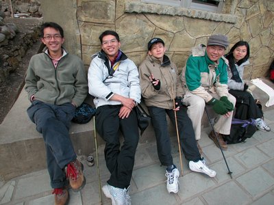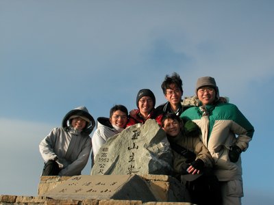 算算時間,我們3點半起床,簡單吃過早餐後就往主峰去。所謂來的好不如來的巧(有誰聽過這句?),辛苦上到山頂不到2分鐘,將…將…將…將…太陽出來了,一切的努力都是值得的,有人來好多次也不見得可以看到日出!山上還看到不怕人的鷦鷯,到處找登山客吃東西掉下的屑屑。山上風大,拍拍照,吃吃登頂罐(我是吃蘋果啦),待了將近一個小時,我們就下山到排雲吃"中餐",吃完就拍拍照下山。人應該都是欠操的,有了前一天的訓練,大家都還算頗有力的,經過狂飆一陣,只在幾處必停的地方休息,就回到了登山口(聽起來好像很快,其實是懶的打字),大家把背包排成一列再拍張照與上山的比較。原本還計劃去遊客中心看看,但是經過了一段上坡的柏油路後,放棄!