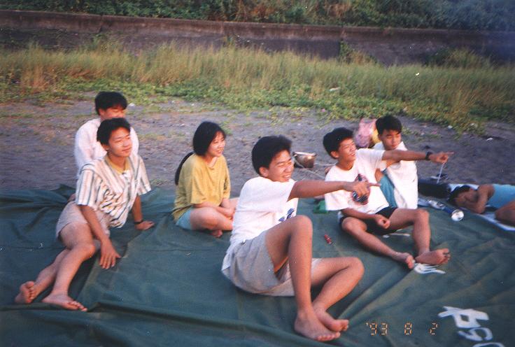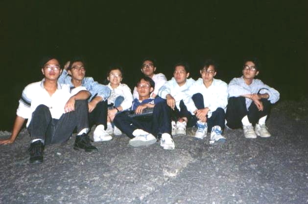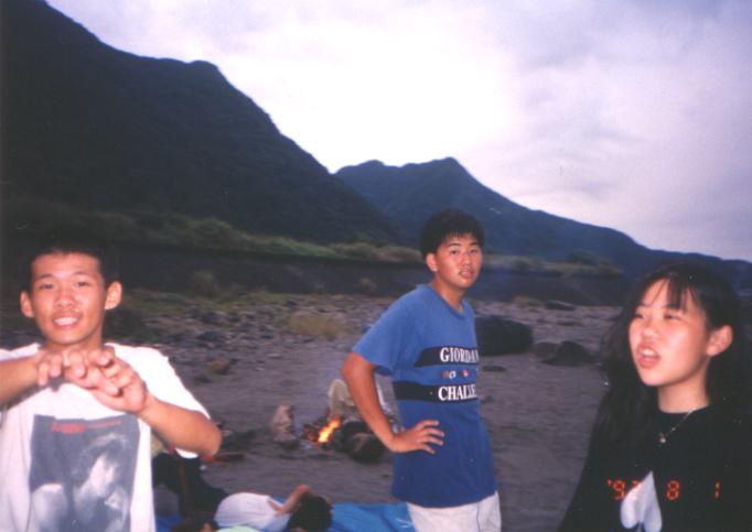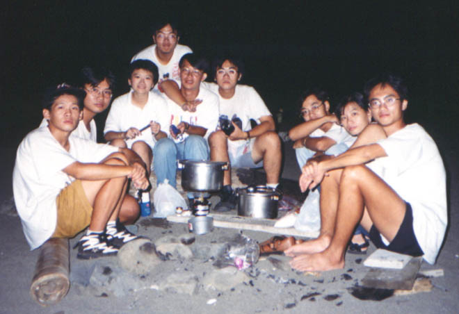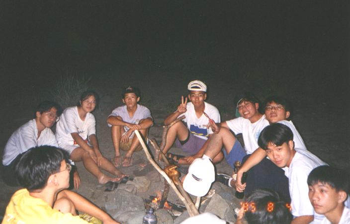 後來大家找到了一塊大岩石可以賞海,睡袋睡墊都成為犧牲品,或坐或躺,眼睛幾乎沒闔過,鄭公也大方地為大家獻唱。幸而雨下的很小,天亮的很快,總算沒讓颱風掃大家的興。天亮後,東西收一收,把枯樹凌虐一番,起了一個大營火,燒完後就到了大溪火車站,準備回台北......
